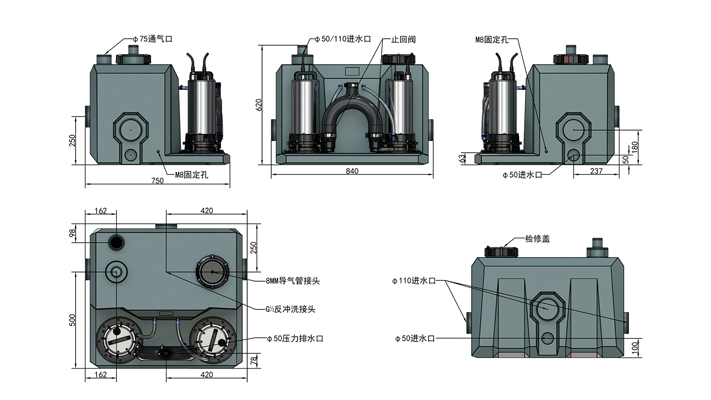 · 入水口:3×φ110,3×φ50,1×φ50/110
