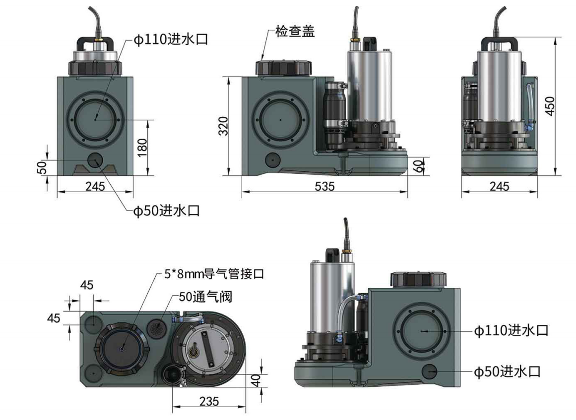 - 入水口:3×Φ110,5×Φ50