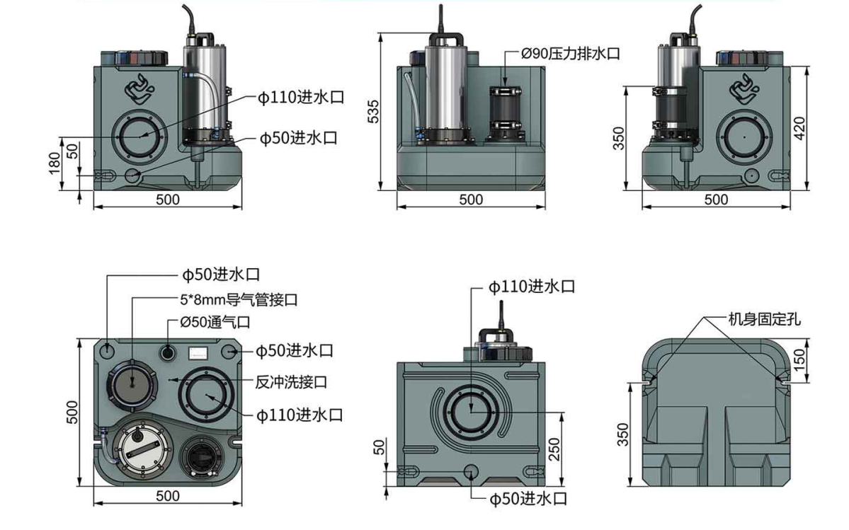 · 入水口:3×φ110,3×φ50,1×φ50/110